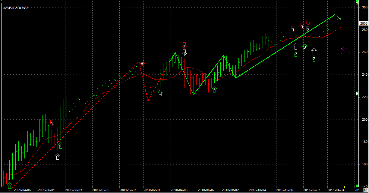 Na Żółwiu sytuacja bez zmian. Tydzień zamknął się na poziomie 2858 pkt, 57 punktów niżej niż w zeszłym tygodniu. System nadal utrzymuje 2 długie kupione po 2789 pkt.