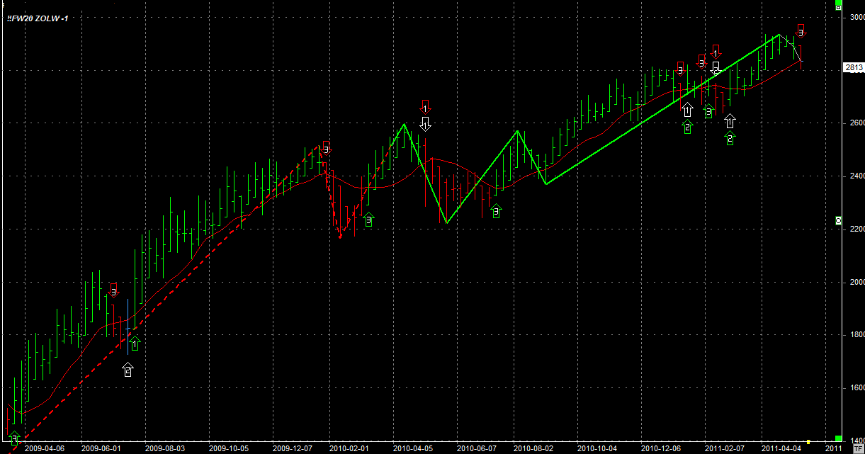 Na Żółwiu zmiana sytuacji. System zamknął 2 pozycje długie na close w piątek po 2813 pkt oraz otworzył jedną krótką po tej samej cenie. Tym samym zajął pozycję, którą zdefiniował jako przeciwną trendowi głównemu.