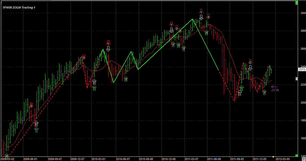 Tydzień zamknął się na poziomie 2373 pkt, 27 pkt wyżej niż tydzień temu. System utrzymuje pozycję długą 1 szt (przeciw trendowi) po 2267 pkt. Stop dla pozycji 2126 pkt.