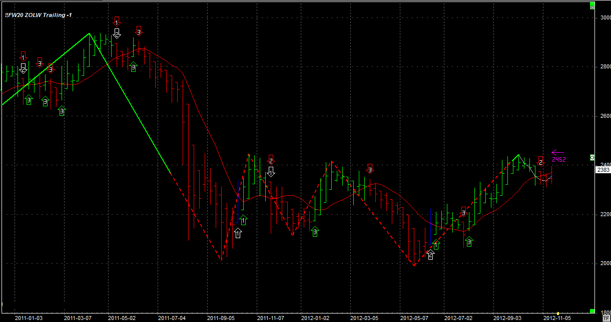 System zajął jedną krótką pozycję (przeciw trendowi) po 2326 pkt. Stop na 2452 pkt.