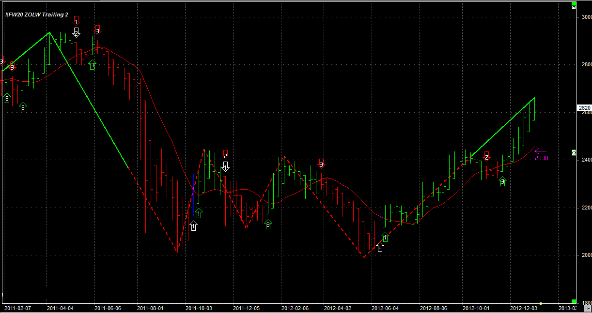 System zajmuje pozycję długą, zgodną z trendem - 2 szt po 2398 pkt. Stop na 2438 pkt