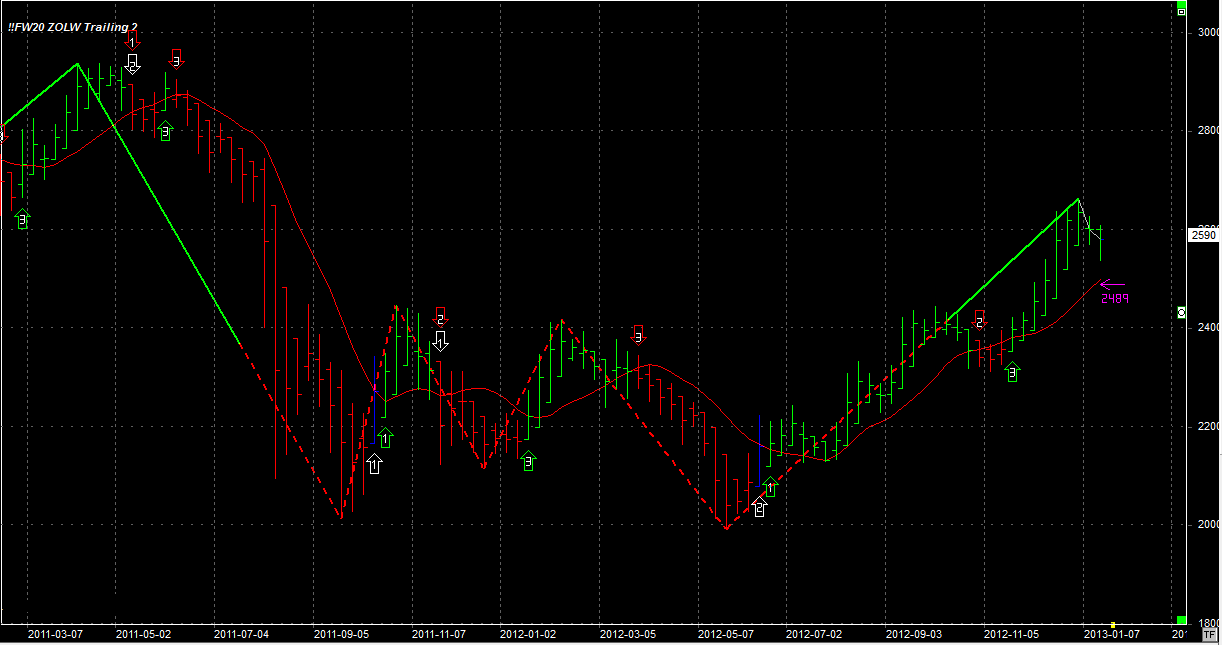 System zajmuje pozycję długą, zgodną z trendem - 2 szt po 2398 pkt. Stop na 2489 pkt