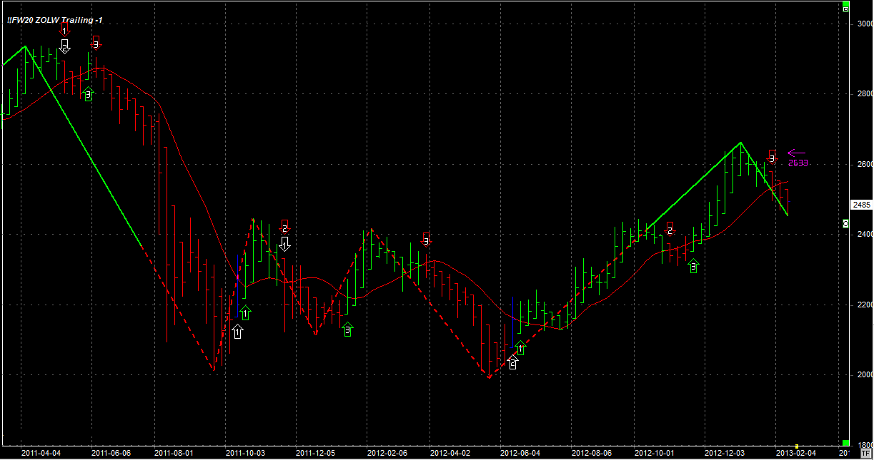 System zajmuje jedną krótką pozycję (przeciw trendowi) po 2514 pkt. Stop dla pozycji krótkiej 2633 pkt.