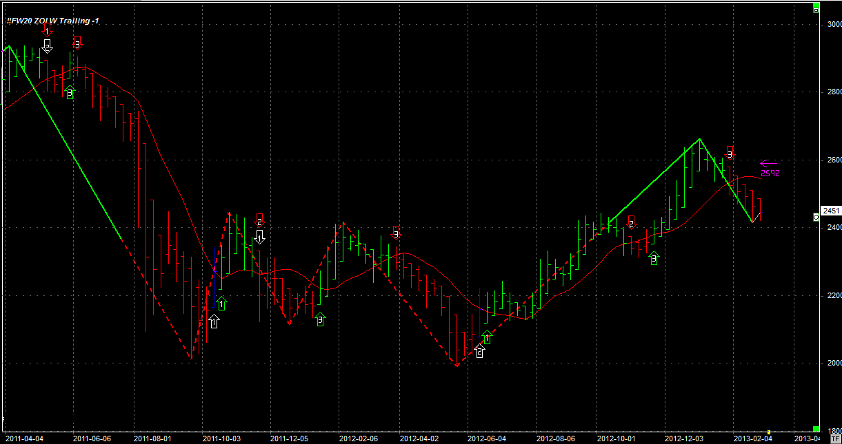 System zajmuje jedną krótką pozycję (przeciw trendowi) po 2514 pkt. Stop dla pozycji krótkiej 2592 pkt.