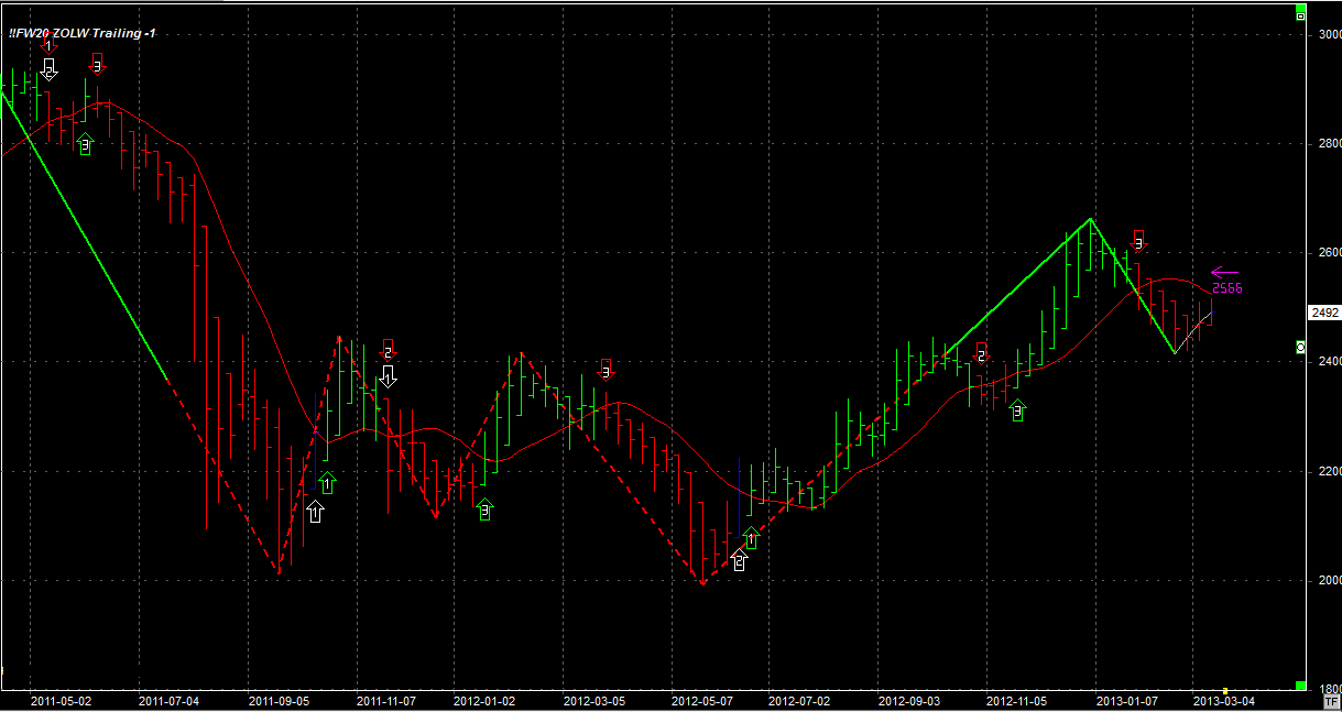 System zajmuje jedną krótką pozycję (przeciw trendowi) po 2514 pkt. Stop dla pozycji krótkiej 2566 pkt.