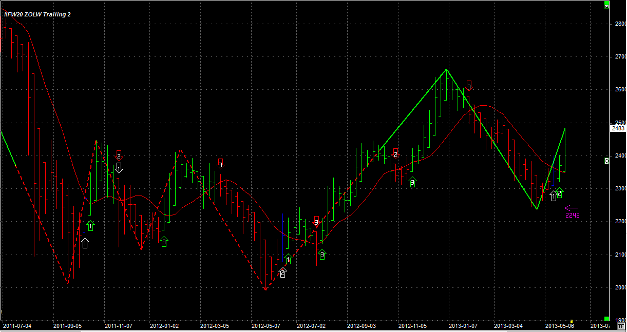 Tydzień zamknął się na poziomie 2483 pkt, 106 pkt wyżej niż tydzień temu. System utrzymuje dwie długie pozycje po 2377 pkt. Stop dla pozycji 2242 pkt.