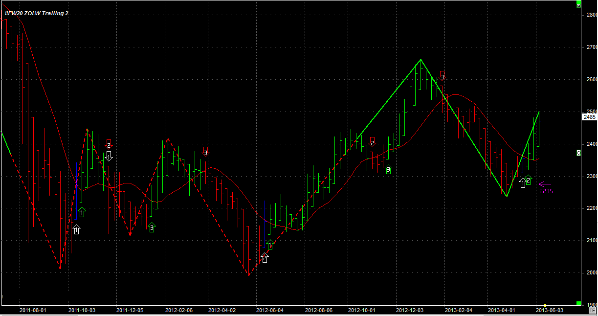 Tydzień zamknął się na poziomie 2485 pkt, 2 pkt wyżej niż tydzień temu. System utrzymuje dwie długie pozycje po 2377 pkt. Stop dla pozycji 2275 pkt.