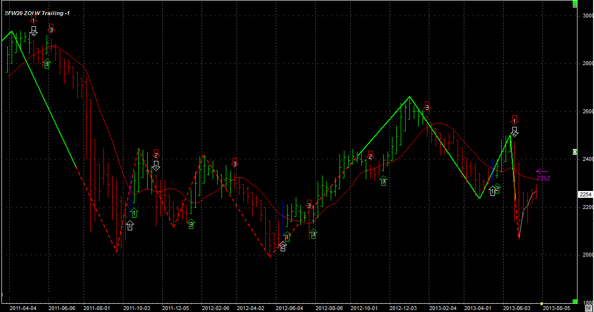 Tydzień zamknął się na poziomie 2254 pkt, 10 pkt niżej niż tydzień temu. System utrzymuje 1 krótką pozycję po 2165 pkt. Stop na poziomie 2352 pkt.
