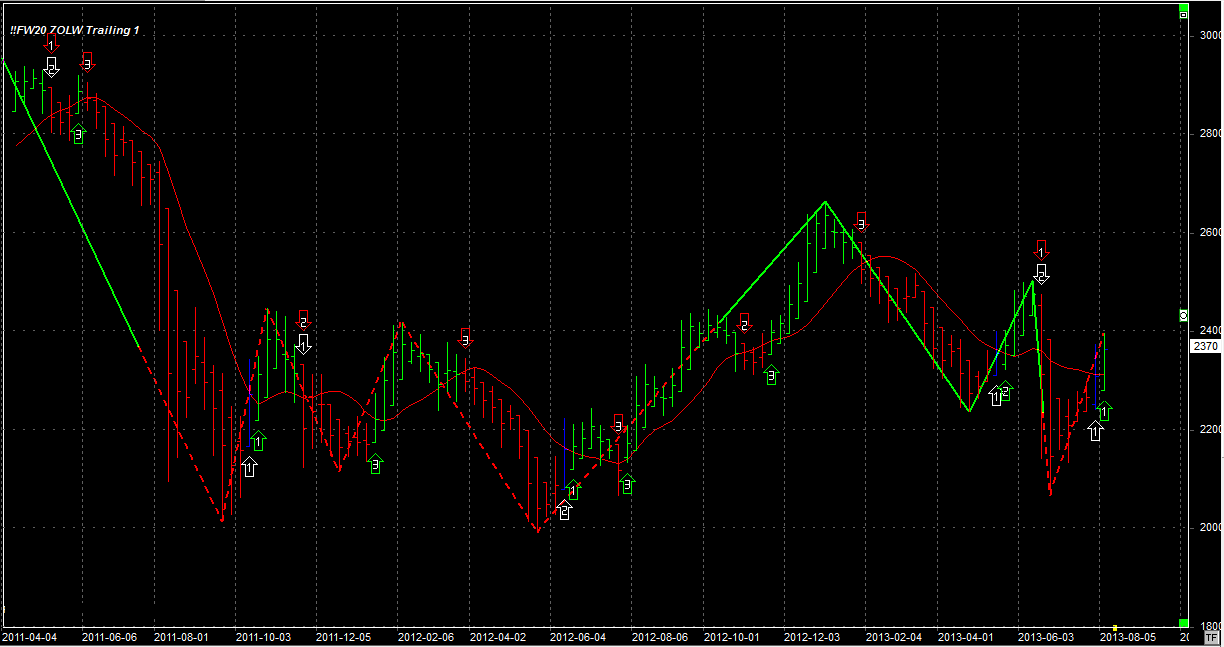 Tydzień zamknął się na poziomie 2370 pkt, dokładnie na tym samym poziomie co tydzień temu. System zajął 1 pozycję długą (przeciw trendowi) na zamknięciu w piątek, po 2370 pkt.