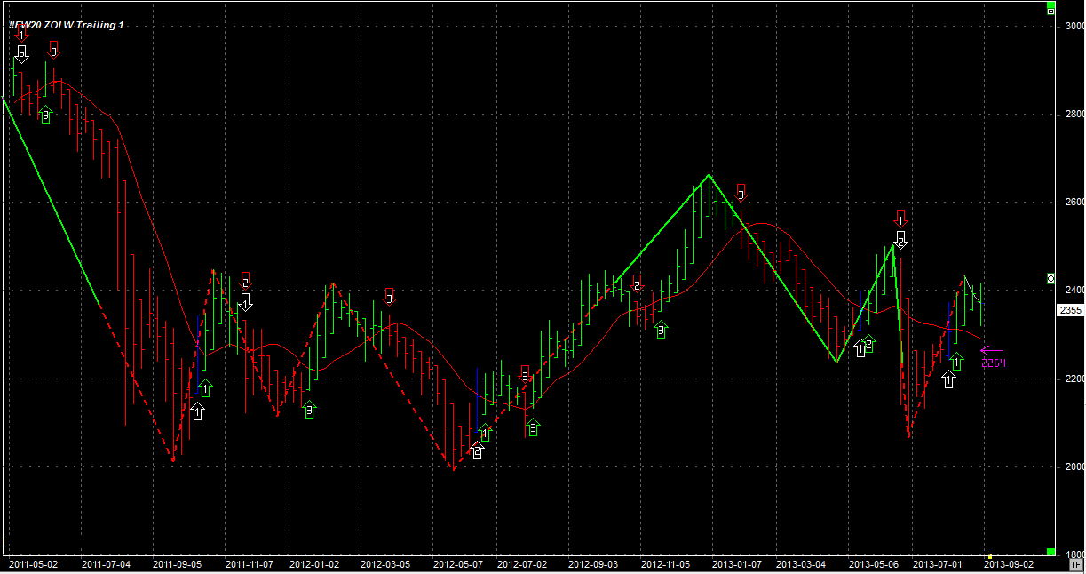 Tydzień zamknął się na poziomie 2355 pkt, 41 pkt niżej niż tydzień temu. System utrzymuje 1 pozycję długą (przeciw trendowi)po 2370 pkt. Stop na poziomie 2264 pkt