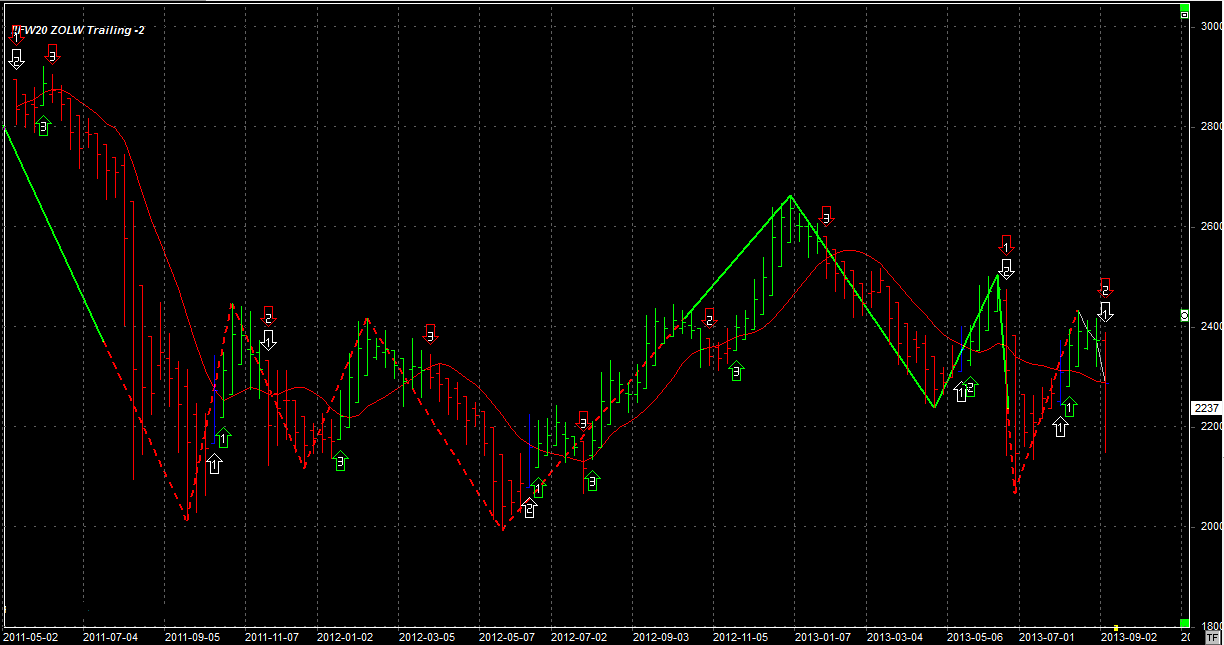 Tydzień zamknął się na poziomie 2237 pkt, 118 pkt niżej niż tydzień temu. System został wystopowany z pozycji długiej kupionej po 2370 pkt na poziomie 2264 pkt, a następnie zajął dwie krótkie pozycje na zamknięciu w piątek po 2237 pkt. Strata z poprzedniej pozycji 106 pkt.
