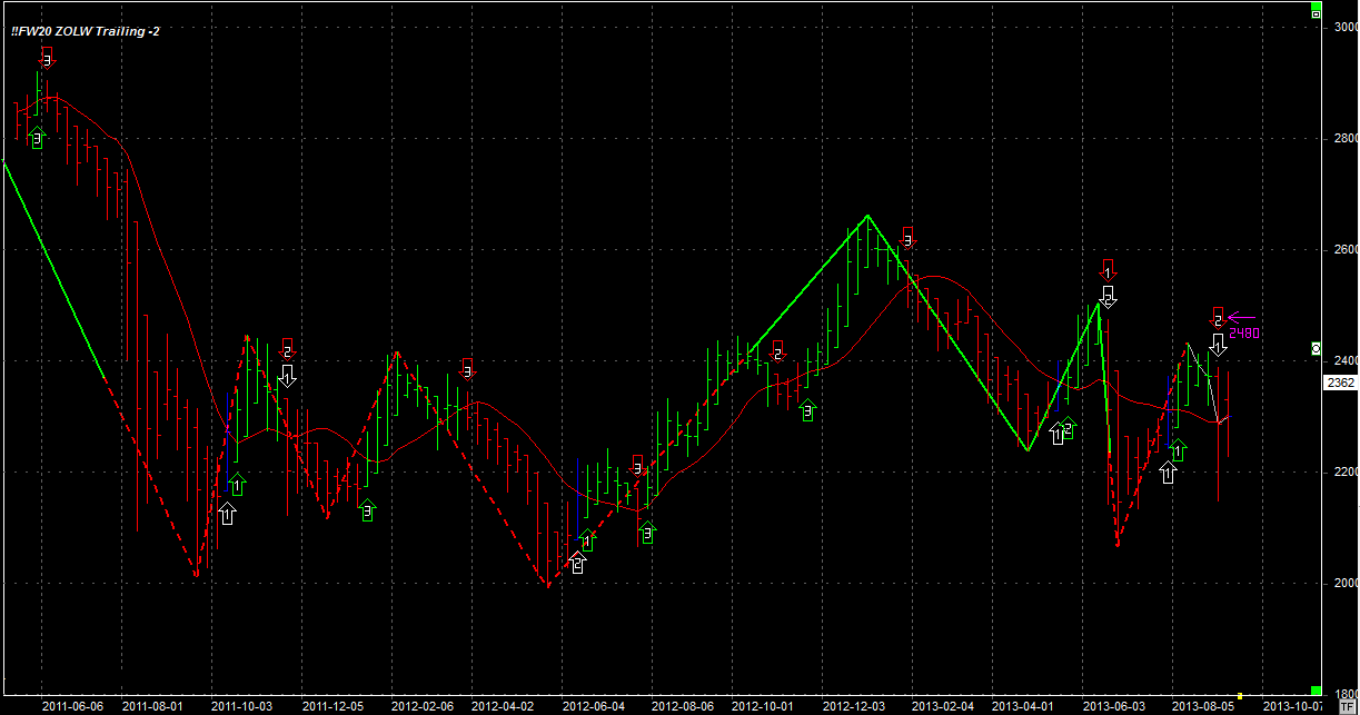 Tydzień zamknął się na poziomie 2362 pkt, 125 pkt wyżej niż tydzień temu. System utrzymuje 2 krókie pozycje po 2237 pkt. Stop na poziomie 2480 pkt.