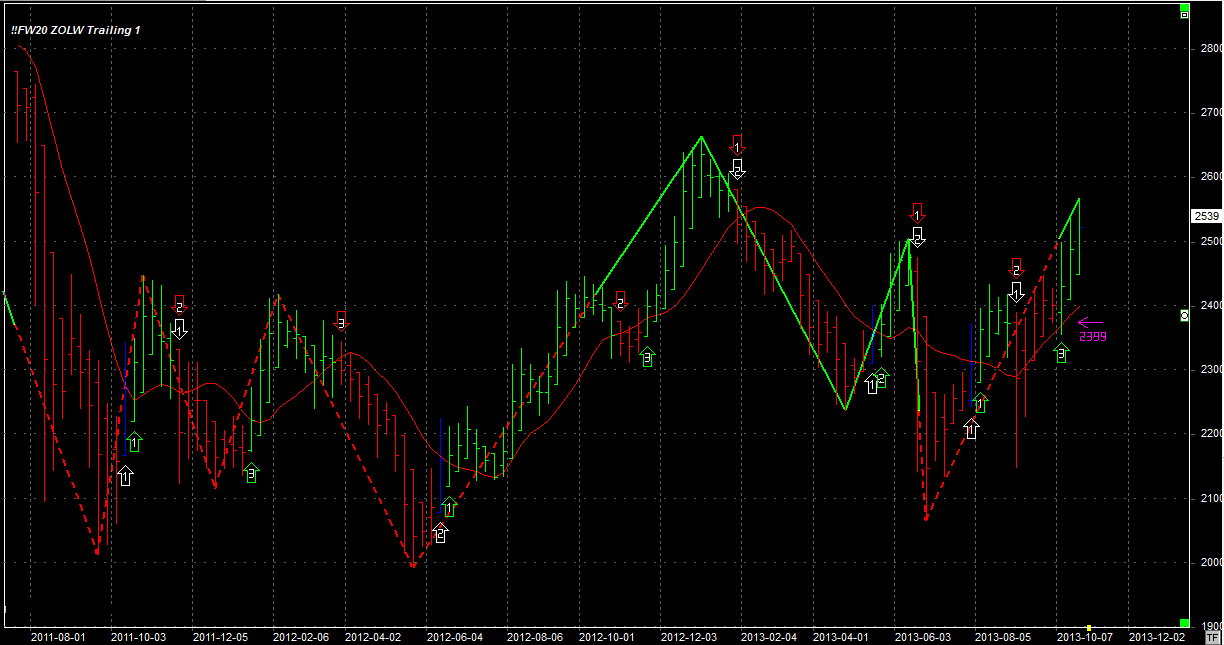 Tydzień zamknął się na poziomie 2539 pkt, 53 pkt wyżej co tydzień temu. System utrzymuje jedną długą pozycję po 2486 pkt. Stop na poziomie 2399 pkt.