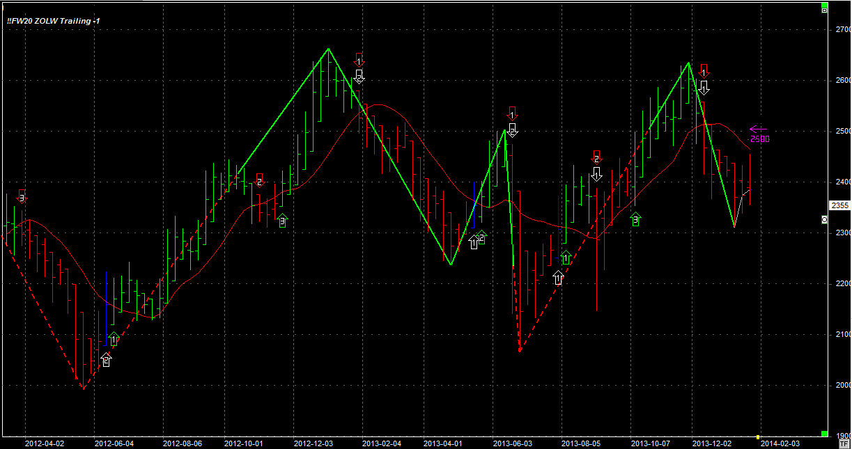 Tydzień zamknął się na poziomie 2355 pkt, 34 pkt niżej niż tydzień temu. System utrzymuje jedną krótką pozycję po 2439 pkt. Stop 2500 pkt.