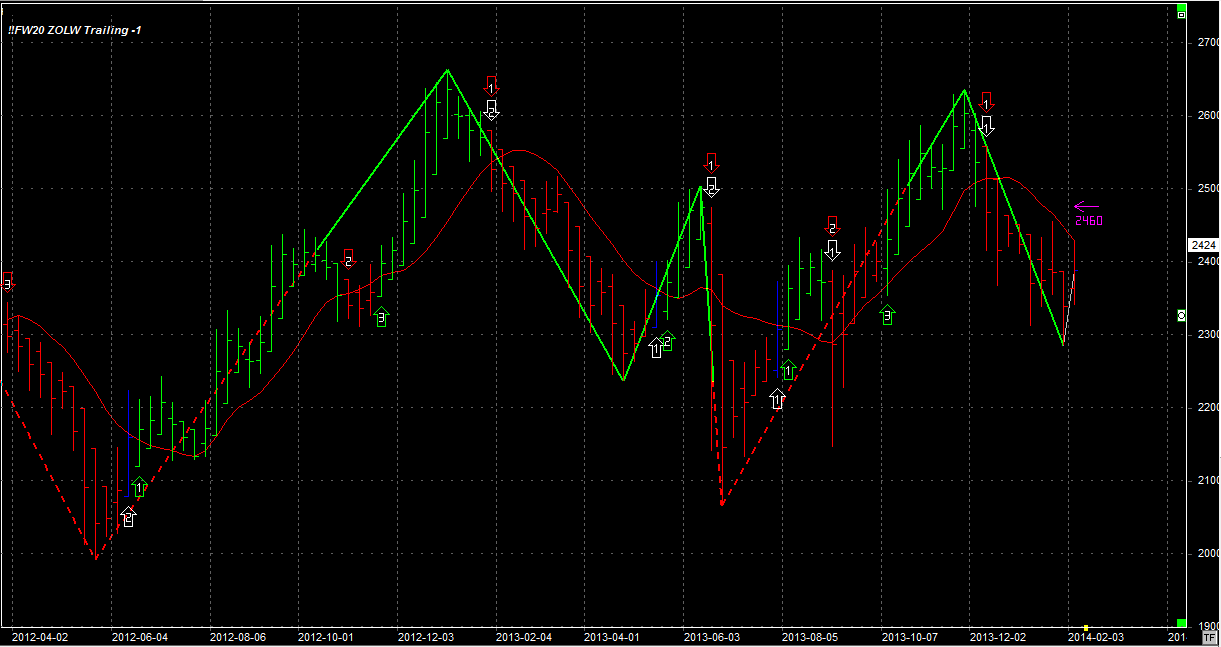 Tydzień zamknął się na poziomie 2424 pkt, 63 pkt wyżej niż tydzień temu. System utrzymuje jedną krótką pozycję po 2439 pkt. Stop 2460 pkt.