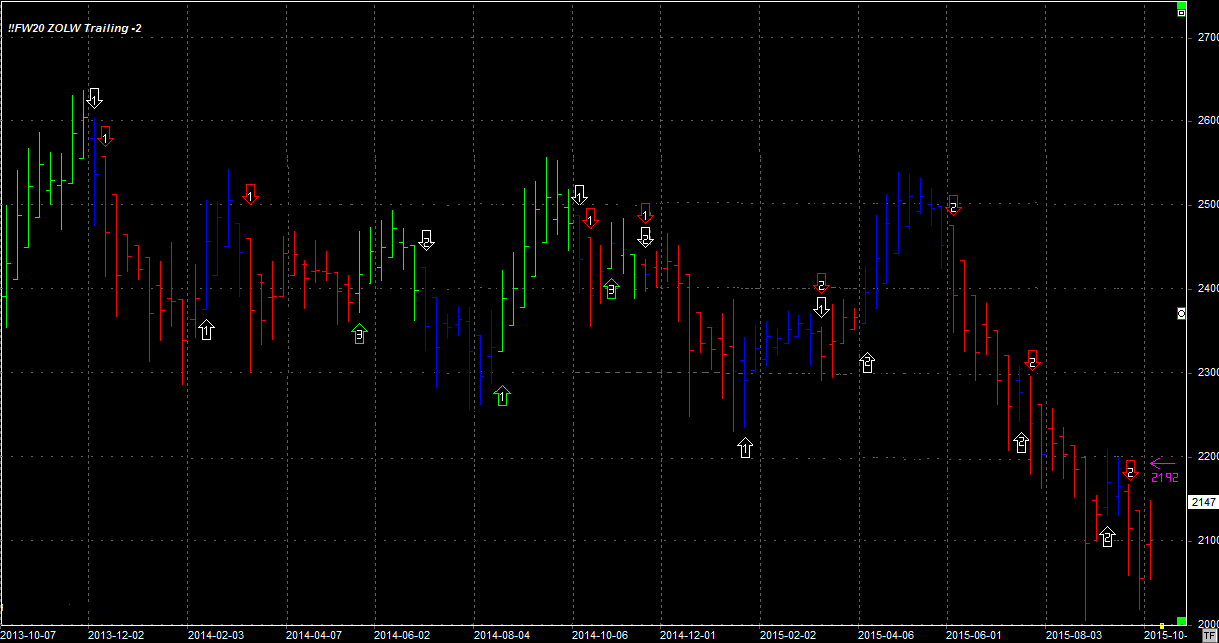 System utrzymuje dwie krótkie pozycje po 2085 pkt. Pozycja zgodna z trendem głównym. Stop na poziomie 2192 pkt.