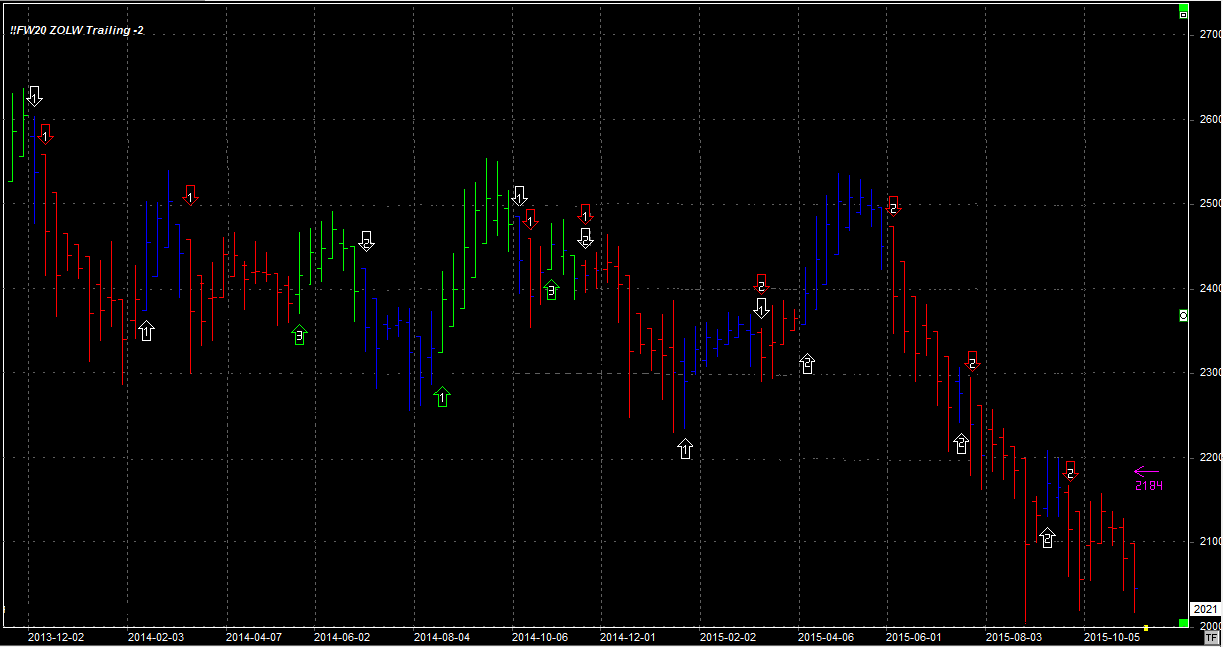 System utrzymuje dwie krótkie pozycje po 2085 pkt. Pozycja zgodna z trendem głównym. Stop na poziomie 2184 pkt.