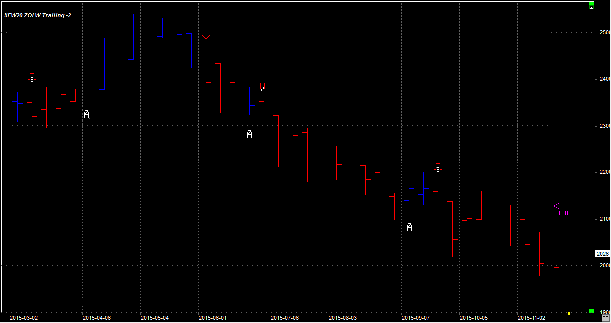 System utrzymuje dwie krótkie pozycje po 2085 pkt. Pozycja zgodna z trendem głównym. Stop na poziomie 2128 pkt.