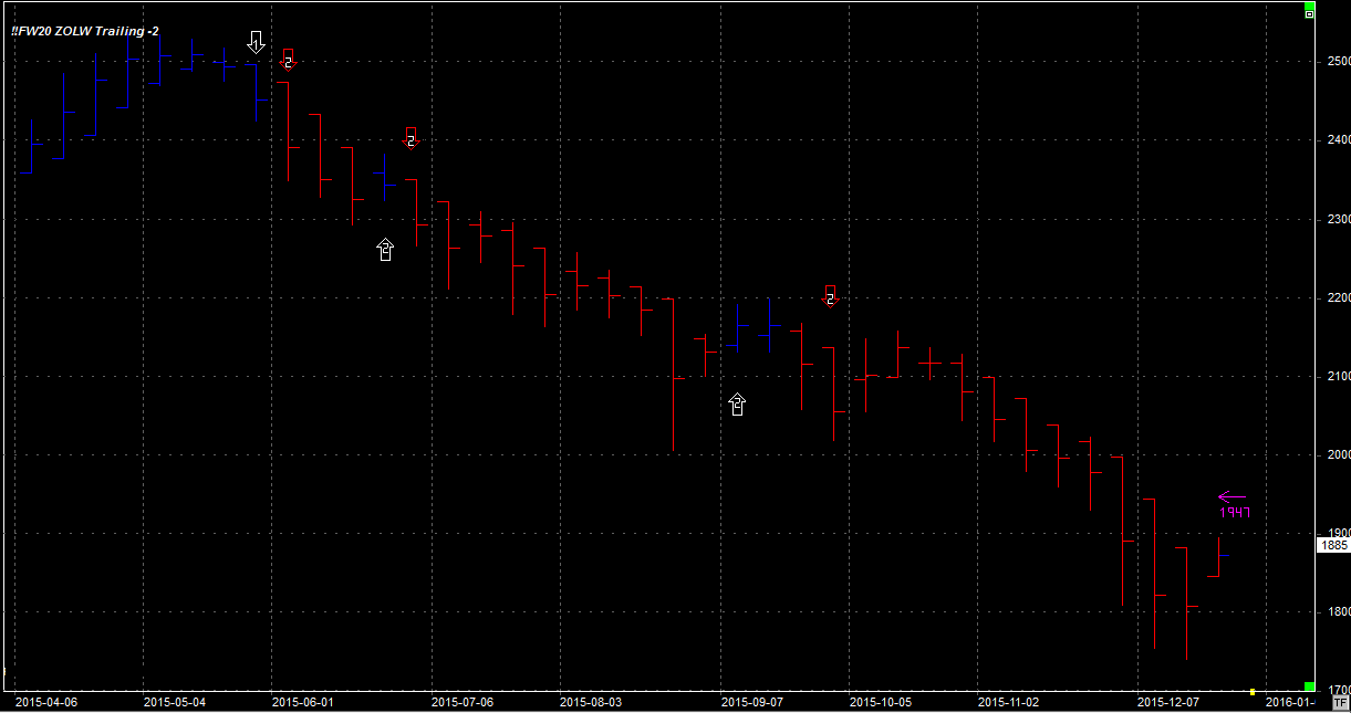 System utrzymuje dwie krótkie pozycje po 2085 pkt. Pozycja zgodna z trendem głównym. Stop na poziomie 1947 pkt.