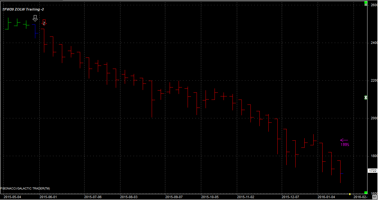 System utrzymuje dwie krótkie pozycje po 2085 pkt. Pozycja zgodna z trendem głównym. Stop na poziomie 1885 pkt.