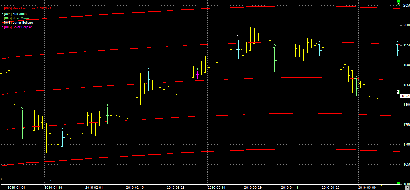 Na wykresie z linami Marsa mamy niestety potwierdzenie przełamania wsparcia na poziomie 1870 pkt. Obecnie rynek powinien szukać nowego ale dopiero 100 pkt niżej. Nów okazał się zbyt słabym elementem aby powstrzyać spadki. Do pełni jeszcze ponad tydzień, więc czasu na dotarcie do kolejnej linii Marsa jest sporo.