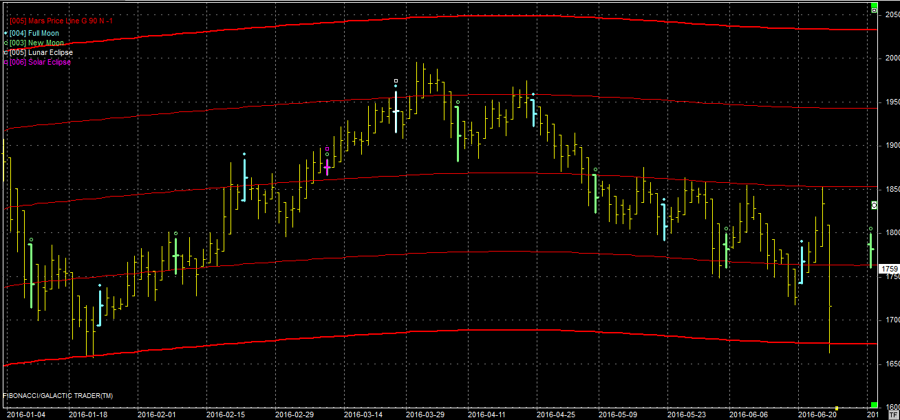 Na wykresie z liniami Marsa mamy przebicie wsparcia na poziomie 1760 pkt. Jest to jednak przebicie dość sztuczne, gdyż wywołane spreadem pomiędzy seriami kontraktów, ok 20 pkt. Stara seria zamknęła się na poziomie 1748 pkt., więc można to traktować jedynie jako naruszenie. Piszę o tym dlatego, że w poniedziałek mamy pełnię księżyca, która jako element zwrotny, może pomóc bykom w ustanowieniu dna. Gdyby sie to nie udało to należy oczekiwać ruchu przynajmniej do kolejnej linii, położonej na poziomie 1670 pkt.