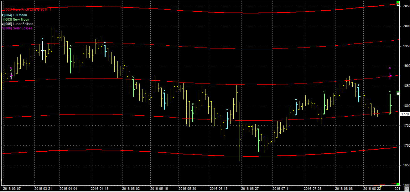 Na wykresie z liniami Marsa jesteśmy na oporze na poziomie 1780 pkt. Powinniśmy odbijać. W czwartek 01.09 jest nów na zaćmieniu Słońca. Jeśli odbicie zacznie się w poniedziałek to może potrwać właśnie do tego nowiu. Jeśli będziemy ubijać dno do czwartku, to wtedy powinno pojawić się odbicie i może potrwać nieco dłużej.