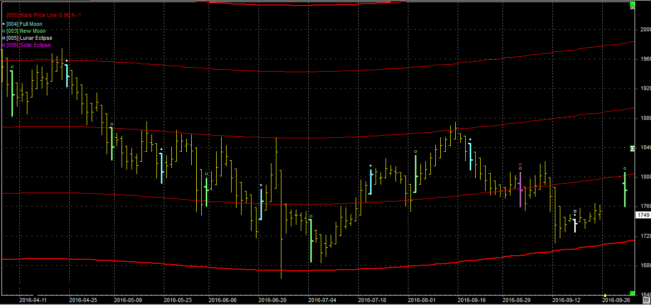 Na wykresie z liniami Marsa powinniśmy w tym tygodniu dotrzeć do linii wsparcia na poziomie 1700 pkt. No chyba że pełnia na zaćmieniu Księżyca zadziała jak element zwrotny. Wydaje się jednak, że prędzej czy później niedźwiedzie zepchną kontrakty do linii wsparcia. Tam będzie łatwiej o obronę rynku.