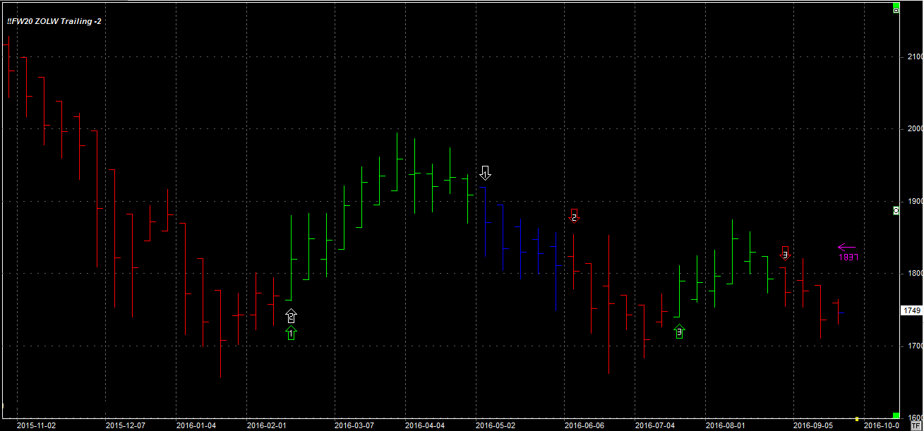 Tydzień zamknął się na poziomie 1749 pkt., 8 pkt. wyżej niż tydzień temu. System utrzymuje dwie pozycje krótkie, zgodne z trendem, po 1765 pkt. Stop dla pozycji 1837 pkt.