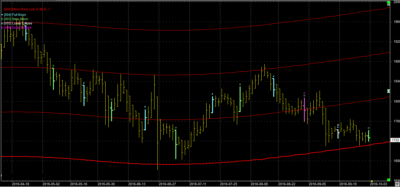 Na wykresie z liniami Marsa ponownie szorujemy okolice wsparcia na linii położonej na poziomie 1710 pkt. Powinniśmy odbijać, zwłaszcza że w sobotę był nów, który powinien pomagać w zmianie tendencji, przynajmniej w krótkim okresie.