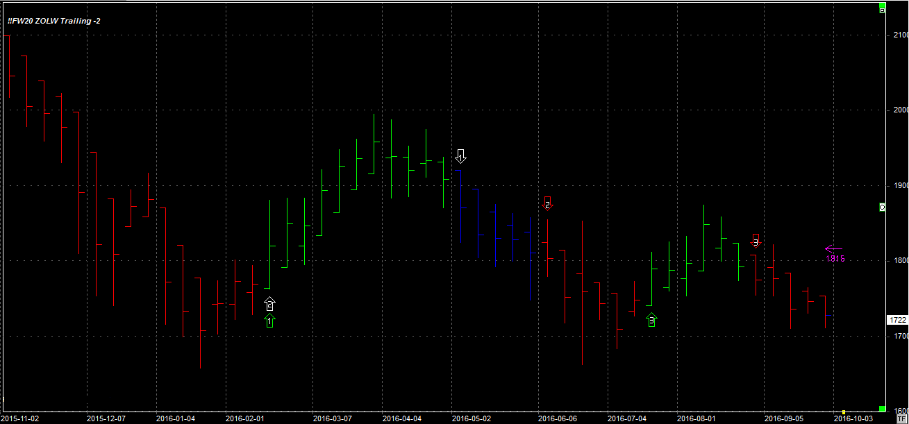 Tydzień zamknął się na poziomie 1722 pkt., 27 pkt. niżej niż tydzień temu. System utrzymuje dwie pozycje krótkie, zgodne z trendem, po 1765 pkt. Stop dla pozycji 1816 pkt.