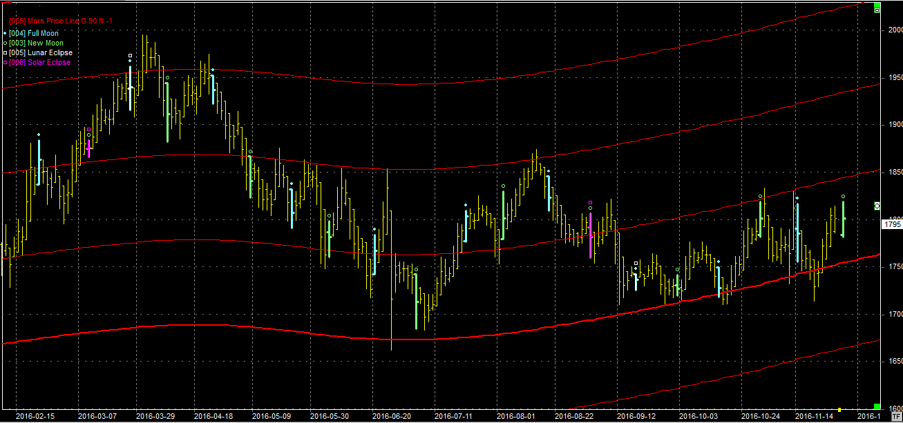 Na wykresie z liniami Marsa bykom jednak udało się wrócić ponad bardzo ważne wsparcie na poziomie 1750 pkt. Obecnie kurs jest w połowie drogi do opory na poziomie 1850 pkt. Widać więc niezdecydowanie, albo wyrównane siły. Obstawiałbym dalsze podejście ale zbliża się nów, który uściśli się 29.11. Jest to element zwrotny i może zakończyć obronny ruch byków. Jeśli uda się jednak przetrwać ten aspekt bez większych zawirowań to otworzy się droga do dalszego podejścia.