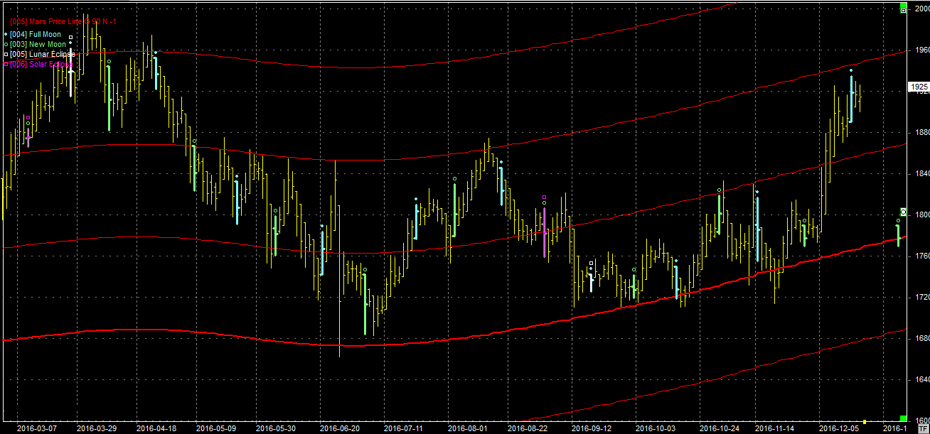 Na wykresie z liniami Marsa ostatnia pełnia mogła wyznaczyć krótkoterminowy szczyt. Oczekuję korekty, która może spokojnie zejść w okolice wsparcia na linii Marsa, na poziomie 1870 pkt.