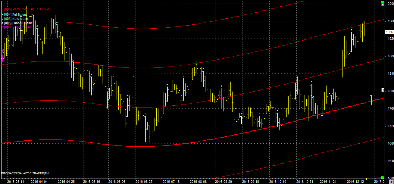 Na wykresie z liniami Marsa nadal kurs bije głową w opór i nadal nie sądzę aby został sforsowany z marszu. Pełnia nie wyznaczyła szczytu, wiec może to zrobić nów, który będzie się uściślał 29.12.16