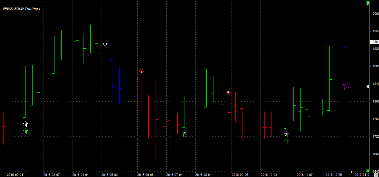 Tydzień zamknął się na poziomie 1936 pkt., 11 pkt. wyżej niż tydzień temu. System utrzymuje pozycję długą 1 szt. na po 1817 pkt. Stop dla pozycji 1799 pkt.