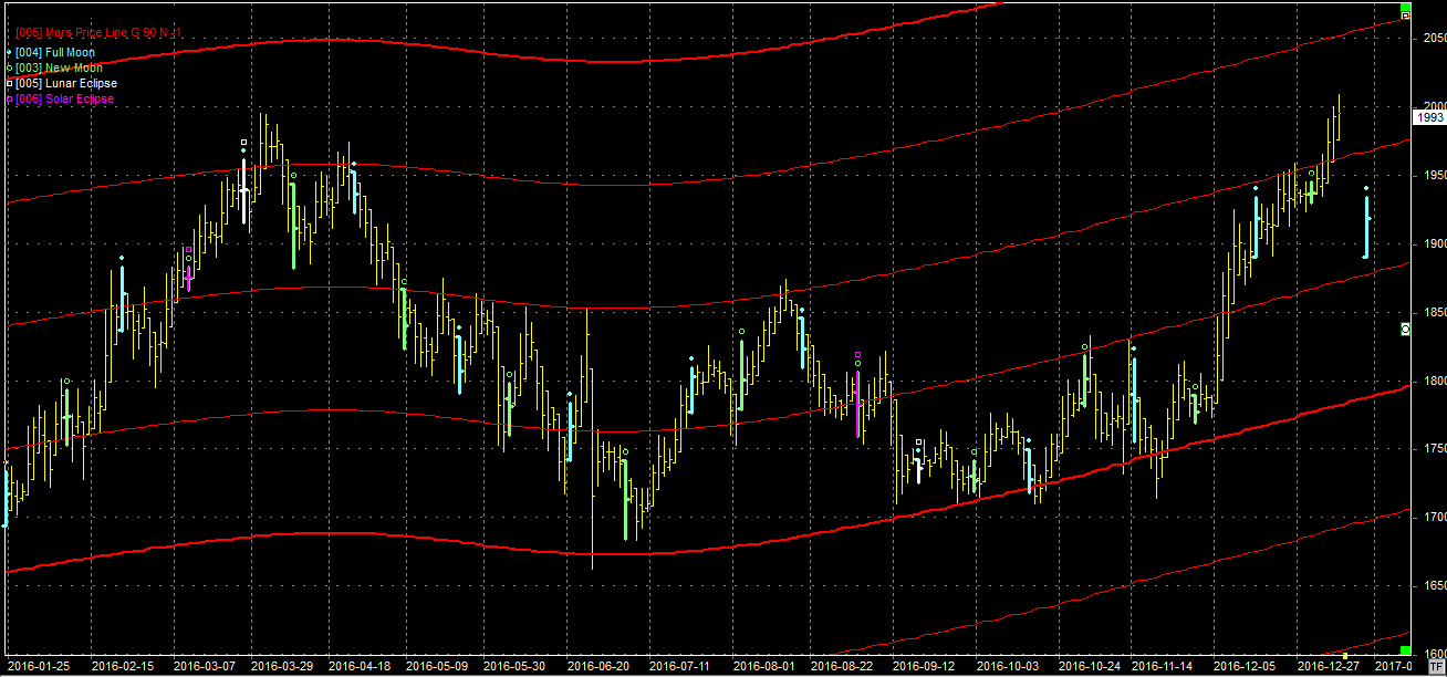 Na wykresie z liniami Marsa mamy jednak przebicie oporu na poziomie 1970 pkt. No może nie przebicie ale mocne naruszenie. W tej chwili rynek powinien się cofnąć i sprawdzić trwałość przebicia. Jeśli test wyszedłby pozytywnie to następnym przystankiem powinna być linia na poziomie 2060 pkt. Następna pełnia uściśla się 12.01.17 (czwartek).