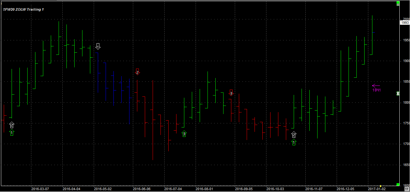 Tydzień zamknął się na poziomie 1993 pkt., 49 pkt. wyżej niż tydzień temu. System utrzymuje pozycję długą 1 szt. na po 1817 pkt. Stop dla pozycji 1841 pkt.