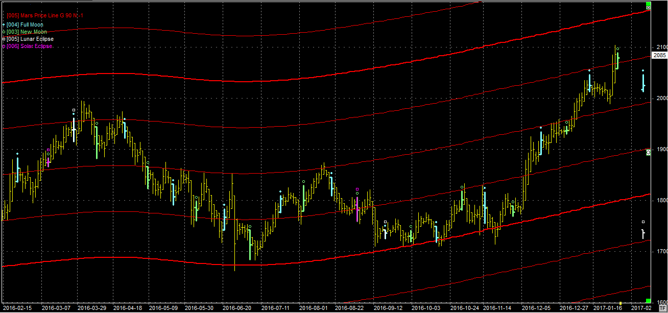 Na wykresie z liniami Marsa mamy zobrazowane dokładnie to, o czym pisałem w poprzednim wejściu, tj. kolejne podejście pod opór na linii położonej w okolicach 2080 pkt. Sobotni nów, jak i opór powinny schłodzić nastroje. W lutym oczekuję większej korekty obecnego podejścia. Wsparcia na liniach Marsa na poziomach: 2000 pkt. i 1900 pkt.