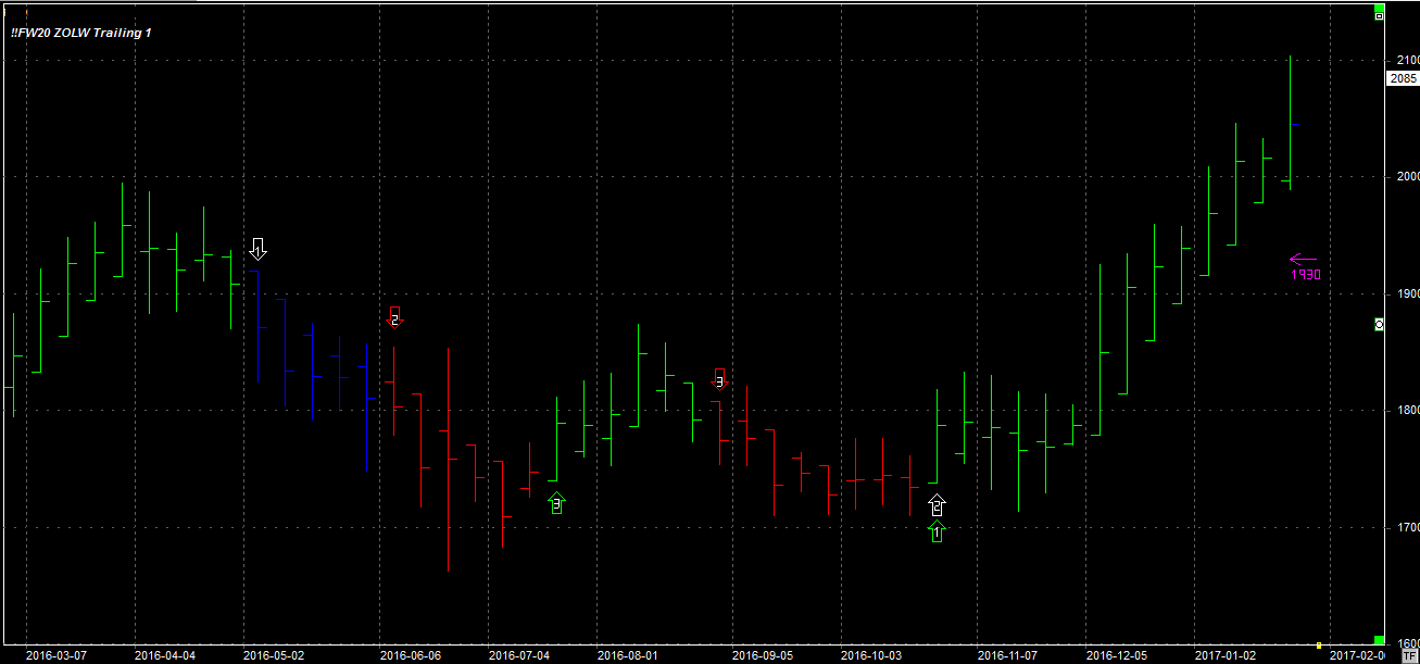 Tydzień zamknął się na poziomie 2085 pkt., 72 pkt. wyżej niż tydzień temu. System utrzymuje pozycję długą 1 szt. po 1817 pkt. Stop dla pozycji 1930 pkt.