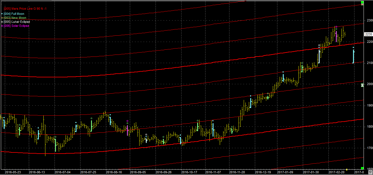 Na wykresie z liniami Marsa, zgodnie z prognozą, byki zaatakowały poziom 2280 pkt. i dotarły do oporu tam położonego. Od tego momentu (czwartek) zaczął się odwrót. Na razie jest to lekkie cofnięcie. Pytaniem pozostaje kierunek jaki nada nów na zaćmieniu Słońca. Może to być dołek, a może zostać wzmocniony ruch spadkowy. Początek tygodnia powinien dać odpowiedź. Jeśli dołek to będziemy świadkami ponownego ataku na 2180 pkt. Jeśli cofnięcie, to po takim ruchu wzrostowym możemy spaść do dwa, trzy piętra. Odpowiednie poziomy to 2180 pkt. i 2100 pkt.