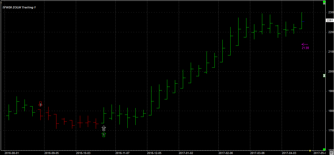 Tydzień zamknął się na poziomie 2261 pkt., 37 pkt. wyżej  niż tydzień temu. System utrzymuje pozycję długą 1 szt.  po 1817 pkt.  Stop dla pozycji 2138 pkt.
