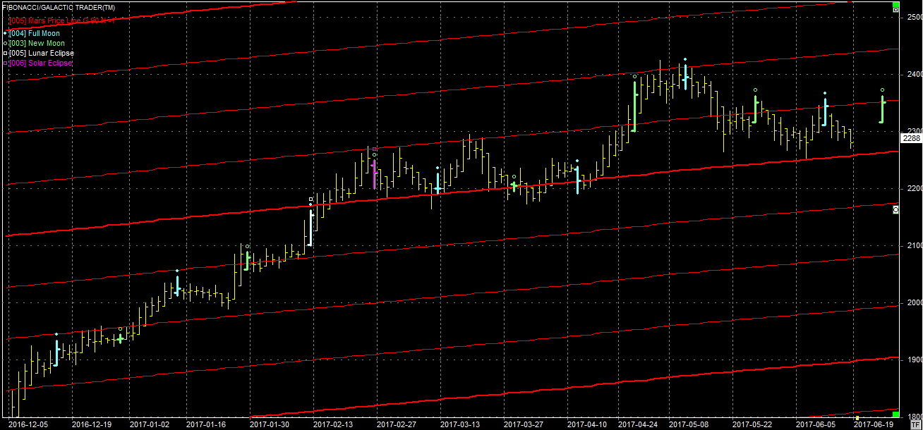 Na wykresie z liniami Marsa widzimy dokładnie jak one działają. Odbicie miało miejsce dokładnie na wsparciu na jednej linii i dotarło do oporu na drugiej. Pełnia powinna zakończyć ten ruch, więc spodziewam się kolejnej fali spadkowej. Tym razem może już nie być tak łatwo z obroną niższej linii.