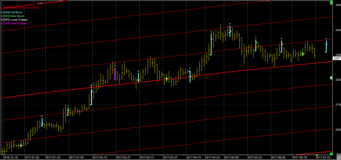 Na wykresie z liniami Marsa cisza i linia prosta. Nie ma co komentować. Być może sobotni nów zwiększy zmienność? Zobaczymy. Poziomy wsparcia i oporu bez zmian.Na wykresie z liniami Marsa zbliżamy się do wsparcia na linii położonej w okolicach 2280 pkt. Jej przebicie, co zakładam, spowoduje zejście w okolice linii na poziomie 2200 pkt. Dopiero tam oczekuję zakończenia korekty. Zatrzymanie spadków na pierwszym wsparciu będzie świadczyło od dość silnym rynku byka.