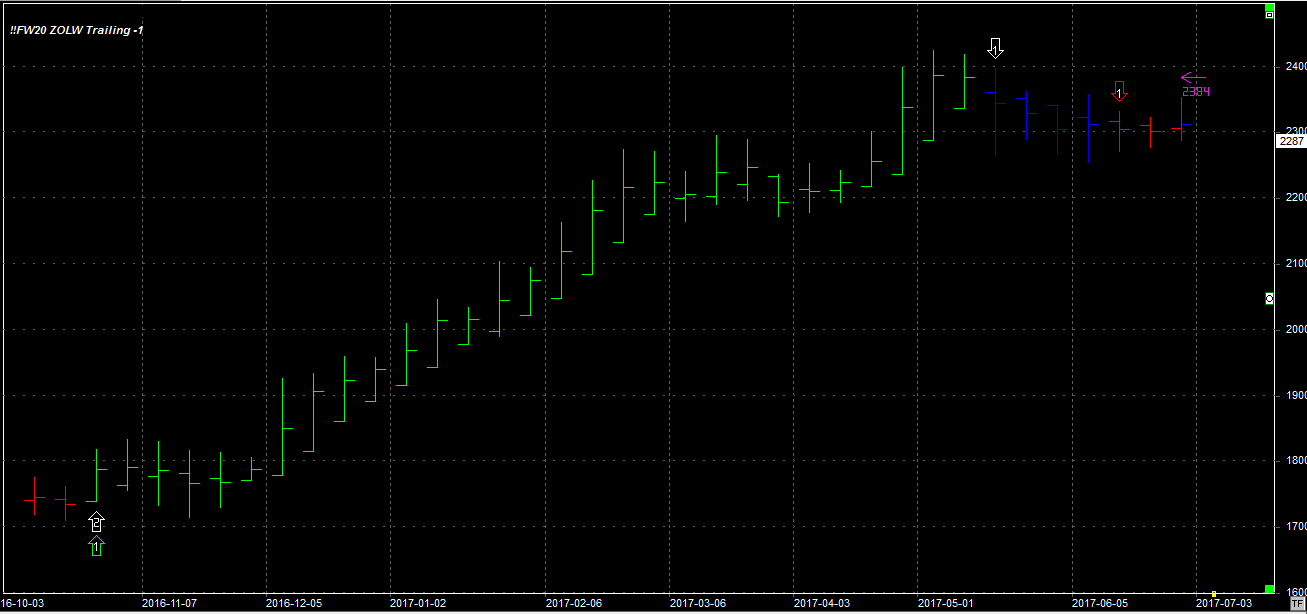 Tydzień zamknął się na poziomie 2287 pkt., 21 pkt. niżej niż tydzień temu. System utrzymuje pozycję krótką po 2304 pkt. Stop dla pozycji 2384 pkt. Pozycja jest grana przeciw trendowi - 1 szt.