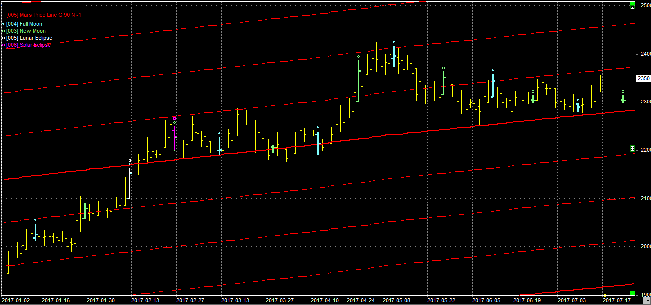 Na wykresie z liniami Marsa widać skutki obrony wsparcia na poziomie 2280 pkt. w towarzystwie pełni (09.07). Jesteśmy ponownie przy oporach, które będą najpewniej testowane w nadchodzącym tygodniu. Ich pokonanie to ruch przynajmniej w okolice następnej linii na 2480 pkt. Taki scenariusz zakładam.
