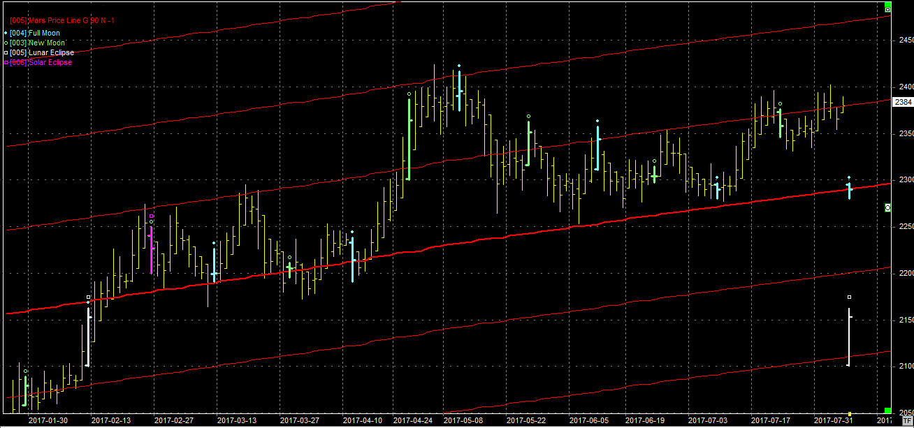 Na wykresie z liniami Marsa nadal byki walczą na oporze na linii w okolicach 2380 pkt. Nie został on pokonany, a do tego mamy nów, który może spowolnić akcję byków, o ile nie odwrócić najświeższej tendencji. Niewielkie odejście od szczytów to jeszcze nie dramat. Głębsze zejście to pojawienie się podaży od zawiedzionych i zapewne powrót do wsparcia na 2300 pkt.