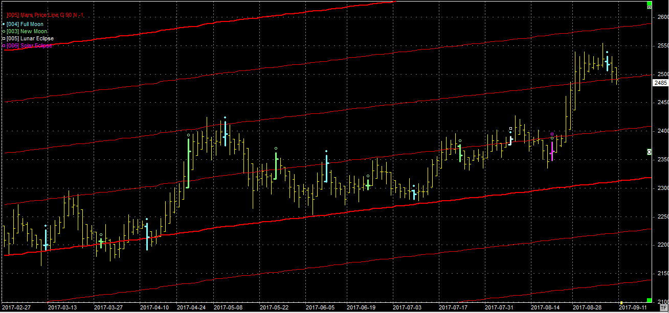 Na wykresie z liniami Marsa mamy wyjście ponad opór na poziomie 2480 pkt., który obecnie jest już na poziomie 2500 pkt. (ruch prosty Marsa powoduje podniesienie linii). Wg mnie wyjście nie jest na razie oczywistym przebiciem i powinno być jeszcze przetestowane od góry. Dobrym do tego momentem będzie środa 06.09.17, kiedy to mamy pełnię Księżyca. Dobre miejsce na wyznaczenie dołka korekty testującej przebity opór.