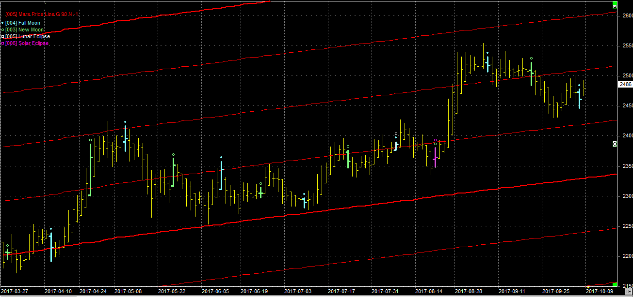 Na wykresie z liniami Marsa ostatnia pełnia mogła wyznaczyć dołek korekty. Był on nieco ponad wsparciem na linii Marsa, przez co bykom może być trudniej o podejście wzrostowe. Tym niemniej do następnego nowiu mają wszystko w swoich rękach i oczekuję ponownego ataku na 2500 pkt. Pokonanie tego poziomu będzie wymagało przełamania oporu na linii Marsa położonej nieco wyżej, a z tym może być już problem.