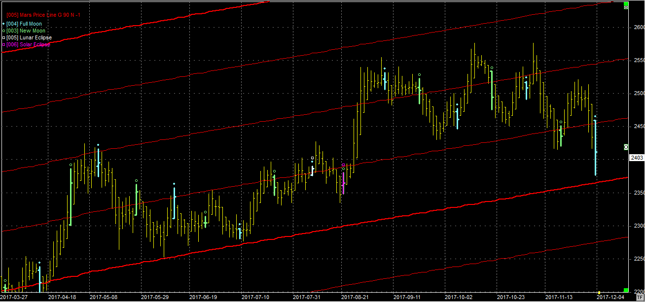 Na wykresie z liniami Marsa ostatni nów wyznaczył datę krótkoterminowego dołka. Od tego czasu widzimy wzrostowe podejście, które może zakończyć się kolejnym atakiem na opór na poziomie 2550 pkt. Problemem może być zbliżająca się pełnia, która wypada 03.12.17 i może powstrzymać rajd św. Mikołaja. Zachowanie przy oporze pokaże nam, czy zarządzający są zdeterminowani by dostać premie za 2017 rok. Jeśli tak, to opór padnie, a my zobaczymy nowe maksima do końca roku.