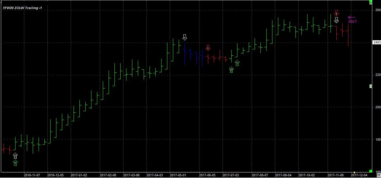 Tydzień zamknął się na poziomie 2403 pkt., 80 pkt. niżej niż tydzień temu. System utrzymuje pozycję krótką 1 szt. po cenie 2448 pkt. Stop na 2557 pkt.